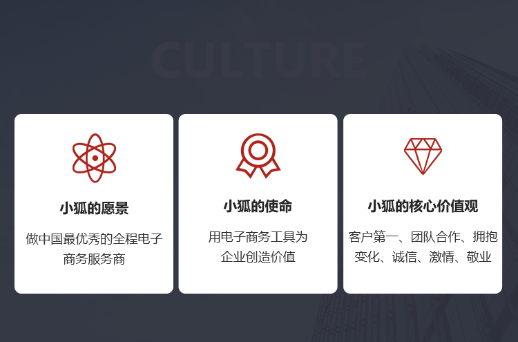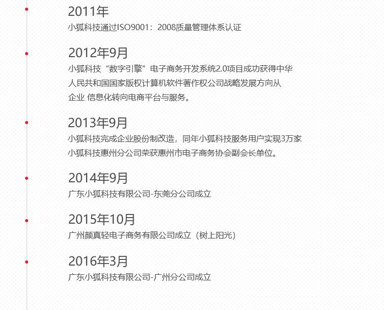 秉承“客户第一、团队合作、拥抱变化、诚信、激情、敬业”的企业精神和“用电子商务为客户创造价值”的企业使命,公司已服务超过50000家国际国内知名企业,业务涵盖汽车、快消、金融、房产、旅游、3C、农业等主流行业,为客户创造了巨大的商业价值,奠定了公司在国内中小型企业电子商务应用领域里的领先地位。 小狐科技在广州、深圳 、惠州、东莞、佛山设立了服务中心及分支机构,员工规模近300人。凭借出色的服务实力和众多的成功案例,公司先后获得了高新技术企业、双软认定企业,惠州市电子商务协会副会长单位、深圳市政府中小企业电商指定服务商、2008年深圳市十大互联网优秀企业、2016广东省百佳电商服务商、2016年十佳微商服务商等荣誉。